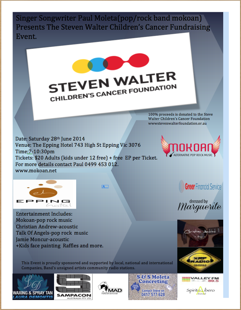 Singer Songwriter Paul Moleta Presents The Steven Walter Children’s Cancer Fundraising Event In Melbourne 28th June 2014 on May 21, 2014May 22, 2014 For more info visit: http://www.stevenwalterfoundation.org.au https://www.facebook.com/pages/Mokoan-Band-Page/406877262760807 Share this: Click to share on X (Opens in new window) X Click to share on Facebook (Opens in new window) Facebook Click to email a link to a friend (Opens in new window) Email Click to share on LinkedIn (Opens in new window) LinkedIn Click to share on Tumblr (Opens in new window) Tumblr Like Loading...